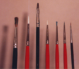 Pictured above is a full range of brushes from a number 4 (on the left) to a 000 (on the right). You can see that the tip of the 0 brush is pretty badly damaged and doesn't come to a good point. I use it for drybrushing now.